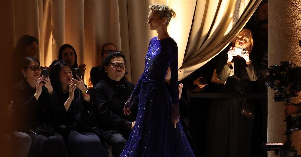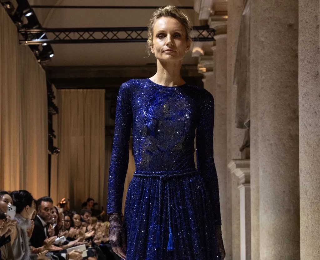 Non sorprende, quindi, che siano stati proprio loro a chiudere la sfilata, mentre l’ultimo capo, scintillante e solenne, portava al centro l’effigie di Giorgio Armani, un faro di luce che ha illuminato la sala come una stella. In quel momento, tra applausi e commozione, l’intero evento ha trovato la sua cifra emotiva più alta, suggellando la continuità di un’eredità che trascende il tempo.
