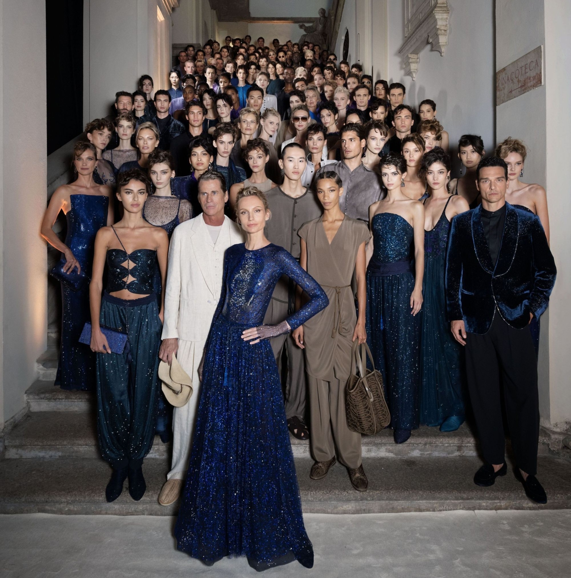 Mentre gli abiti facevano capolino sotto il porticato del maestoso palazzo, la passerella sembrava un racconto dei cinquant’anni di lavoro dello stilista: un viaggio che ricordava a tutti come il suo spirito e la sua visione continuino a vivere con forza straordinaria, non solo attraverso le collezioni, ma anche attraverso le persone che hanno condiviso il suo percorso. Ogni sguardo, ogni passo, ogni tessuto sembrava celebrare un lascito prezioso, l’impronta di un’arte sartoriale che ha trasformato la Giorgio Armani S.p.A. in un modello di eccellenza globale, in una casa in cui trovare ispirazione, dedizione e passione, e per la quale molti hanno scelto di dare il meglio di sé.