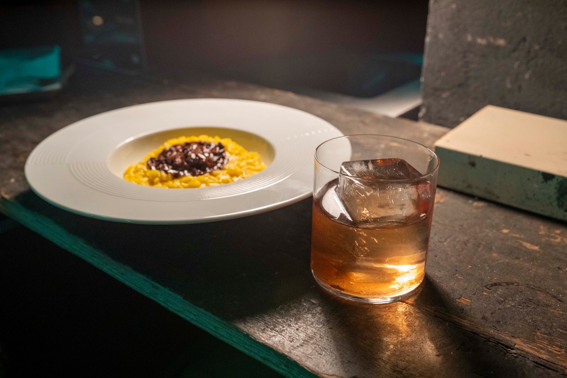 Risotto allo zafferano con melanzane caramellate, cioccolato Sao Thomé e grue di cacao, accompagnato da un cocktail con Diplomático Mantuano, vermouth bianco al riso tostato, pompelmo e lampone fermentato.