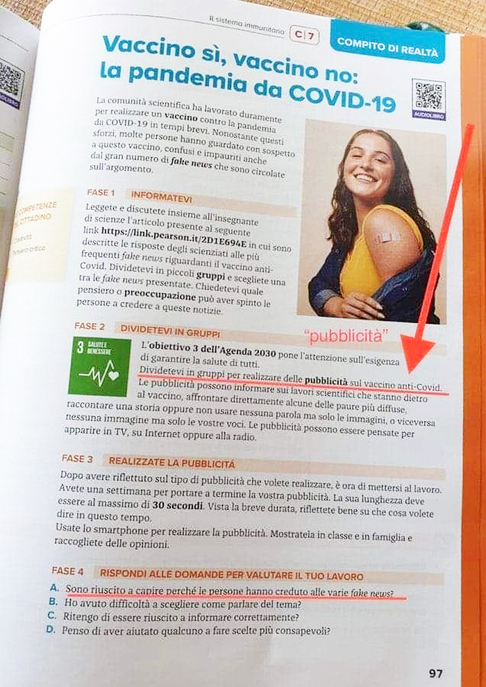 Prima nei media e ora anche tra i banchi, la propaganda pro vaccino del governo sbarca ufficialmente su un testo scolastico per le scuole medie edito da Pearson. Per alcuni un segnale di come l'esecutivo stia puntando a fare breccia anche tra gli studenti con la linea politica dell'emergenza sanitaria perpetua. Nel testo in questione, viene chiesto a bambini e ragazzi di discutere sul fenomeno delle fake news e di realizzare come esercizio una pubblicità sul vaccino anti Covid. La casa editrice Pearson Italia, nata nel 2007 dalla fusione tra la G.B. Paravia di Torino e la Edizioni Scolastiche Bruno Mondadori di Milano, è da sempre impegnata nel campo dell'editoria scolastica.