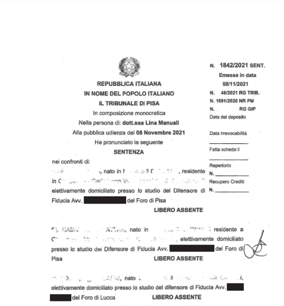 Ecco la sentenza del giud. Dott.ssa Lina Manuali del Tribunale di Pisa emessa l'8 novembre 2021 e depositata in data 17 febbraio 2022, n. 1842/2021.
