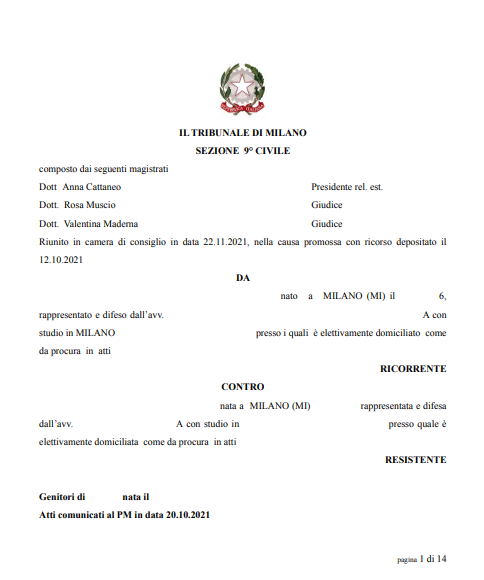 In udienza, celebrata innanzi al Presidente relatore, Anna Cattaneo e ai Giudici, Rosa Muscio e Valentina Maderna, della Sezione 9° del Tribunale dei Milano, venivano sentite le parti e la minore che si esprimeva come segue: