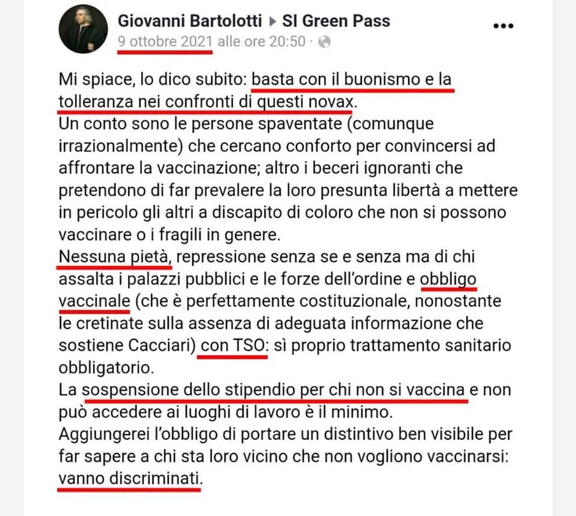 E ancora scriveva: "Nessuna pietà, repressione senza se e senza ma di chi assalta i palazzi pubblici e le forze dell’ordine e obbligo vaccinale (che è perfettamente costituzionale, nonostante le cretinate sulla assenza di adeguata informazione che sostiene Cacciari) con TSO: sì proprio trattamento sanitario obbligatorio. La sospensione dello stipendio per chi non si vaccina e non può accedere ai luoghi di lavoro è il minimo. Aggiungerei l’obbligo di portare un distintivo ben visibile per far sapere a chi sta loro vicino che non vogliono vaccinarsi: vanno discriminati".