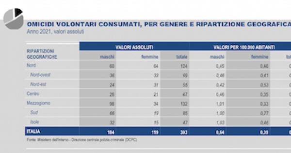 Nel 2020 infatti si è registrato un decremento netto del tasso per gli uomini, da 0,70 del 2019 a 0,59 per 100.000 maschi nel 2020. Nel 2021 invece gli omicidi che hanno interessato le vittime di sesso maschile sono incrementate fino a uno 0,64 su 100.000 abitanti.