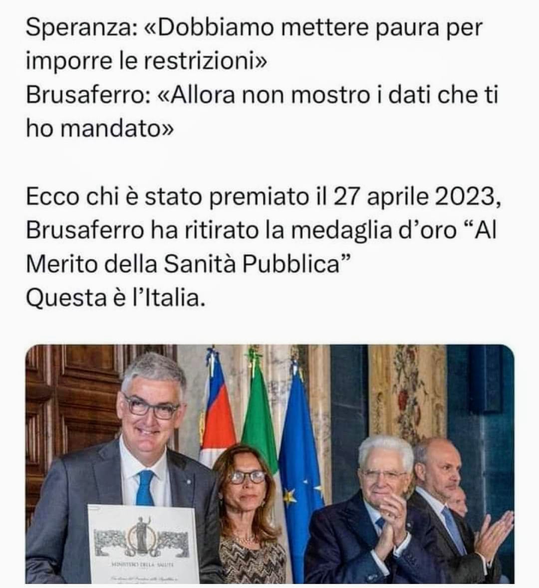 Lei ha insignito con la massima onorificenza l'ISS, quello stesso istituto che, nella persona del suo presidente, Brusaferro, chattava col Ministro Speranza su come NASCONDERE i dati, ometteva di diffondere la reale utilità dei tamponi, delle mascherine e, soprattutto, esprimeva "pareri" volti solo a dare un contorno di "scientificità" a decisioni che NULLA avevano di scientifico.