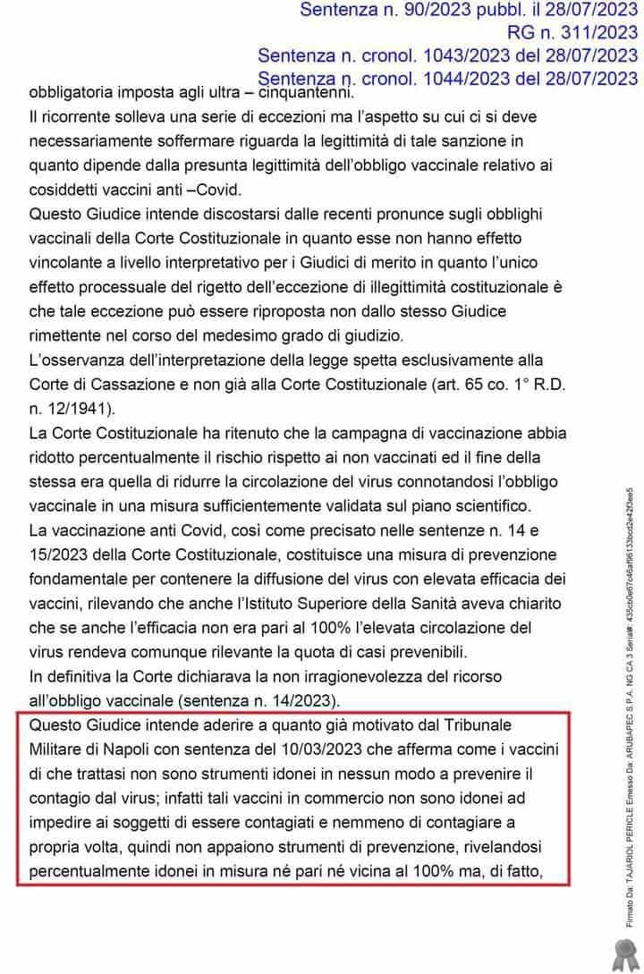 Il giudice di Pace si è rifatto alla recente sentenza del tribunale penale di Napoli che ha annullato la sanzione ad un militare, sottolineando che un vaccinato può contagiare ed essere contagiato come un non vaccinato. "È notorio che i vaccini che sono in commercio non sono idonei ad impedire il contagio e di contagiare e non appaiono strumenti di prevenzione, rivelandosi percentualmente idonei in misura né pari ne vicina al 100% ma di fatto prossima allo zero. L’efficacia vaccinale non può quindi ritenersi provata quale strumento di prevenzione tenuto conto del fatto notorio che soggetti vaccinati possono contrarre e trasmettere il contagio, quindi sia i vaccinati che i non vaccinati debbono essere trattati come soggetti tra loro equivalenti".