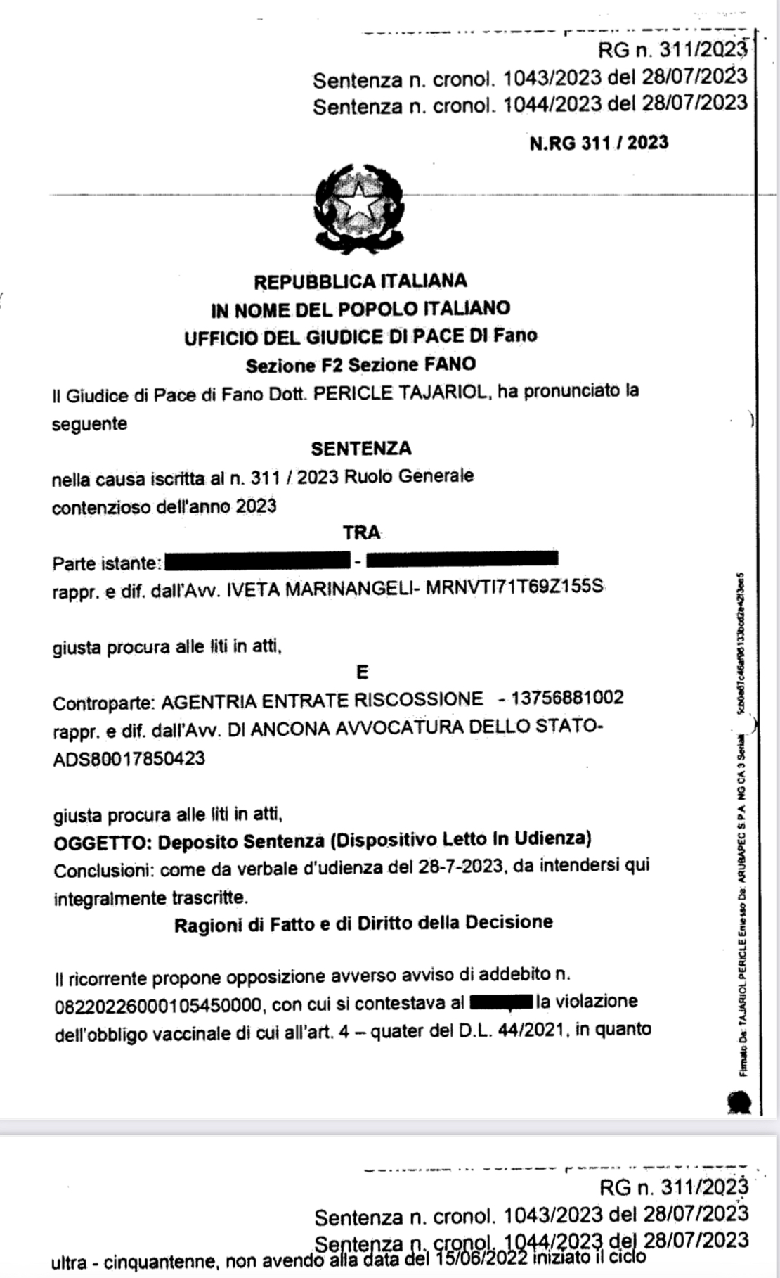 Il giudice di Pace di Fano ha accolto il ricorso di due 65enni che si erano opposti alla vaccinazione e per questo avevano ricevuto la classica multa da 100 euro. Lei una casalinga, lui un promotore finanziario, hanno deciso di fare ricorso tramite il legale Alessandro Angeletti: ricorso che è stato accolto dal giudice di Pace di Fano Pericle Tajariol, il quale nelle motivazioni della sua sentenza non ha mancato di sottolineare la fallace risposta del siero, specie per "prevenire il contagio".