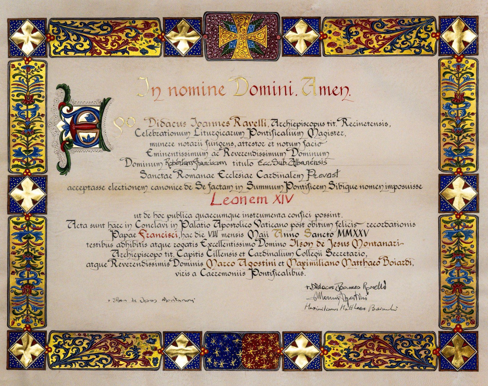 Di seguito la traduzione in italiano: "Io, Diego Giovanni Ravelli, Arcivescovo titolare di Recanti, Maestro delle Celebrazioni Liturgiche Pontificie, in qualità di notaio, attesto e faccio conoscere l'Eminentissimo e Reverendissimo Signore Roberto Francesco con il titolo di Ecc. Sub. Il cardinale Prevosto di Santa Romana Chiesa di Albano ha accettato l'elezione canonicamente fatta di sé a Sommo Pontefice e si è imposto il nome di Leone XIV, affinché a questo proposito possano essere redatti eventuali atti pubblici. Queste cose furono fatte in Conclave nel Palazzo Apostolico Vaticano, dopo la morte di Papa Francesco, di felice memoria, in questo giorno 8 maggio dell'Anno Santo 2025, avendo come testimoni e richiesti l'Eccellentissimo Signor Ilson de Jesus Montanari, Arcivescovo titolare. Il Capo della Sede di Cille e Segretario del Collegio Cardinalizio, e i Reverendissimi Signori Marco Agostini e Maximiliano Matthaeo Boiardi, uomini delle Cerimonie Pontificie".
