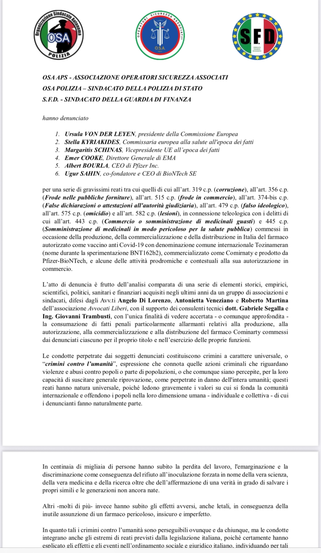 L’atto di denuncia è frutto dell’analisi comparata di una serie di elementi storici, empirici, scientifici, politici, sanitari e finanziari acquisiti negli ultimi anni da un gruppo di associazioni e sindacati, difesi dagli Avv.ti Angelo Di Lorenzo, Antonietta Veneziano e Roberto Martina dell’associazione Avvocati Liberi, con il supporto dei consulenti tecnici dott. Gabriele Segalla e Ing. Giovanni Trambusti, con l’unica finalità di vedere accertata - o comunque approfondita - la consumazione di fatti penali particolarmente allarmanti relativi alla produzione, alla autorizzazione, alla commercializzazione e alla distribuzione del farmaco Cominarty commessi dai denunciati ciascuno per il proprio titolo e nell’esercizio delle proprie funzioni.