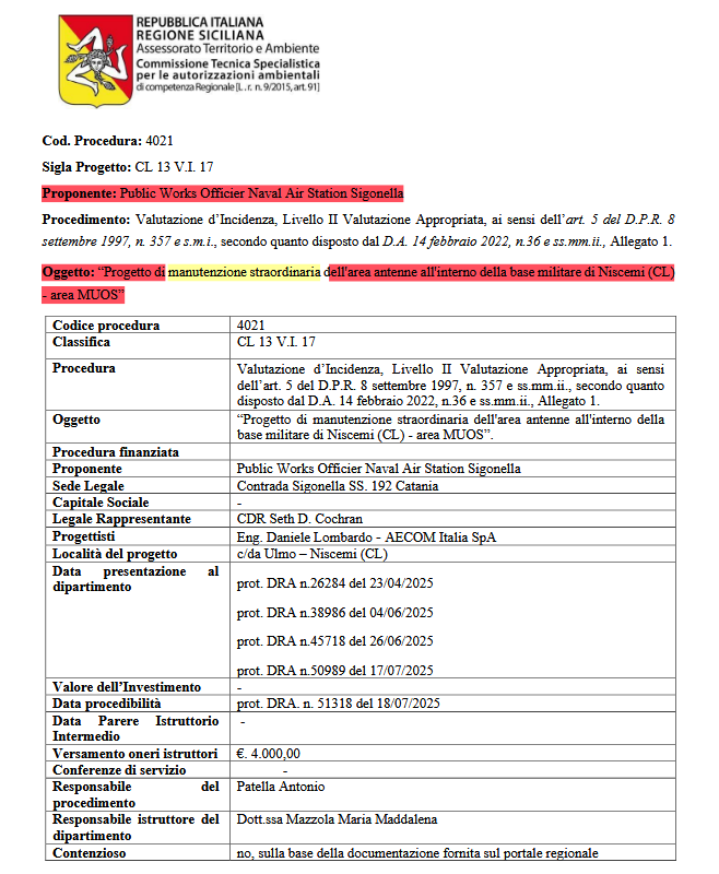 Decreto assessoriale n. 259 09/2025: https://www.ilgiornaleditalia.it/userUpload/DA_n_259_del_1592025__richiesta_lavori_messa_in_sicurezza_MUOS_Niscemi.pdf