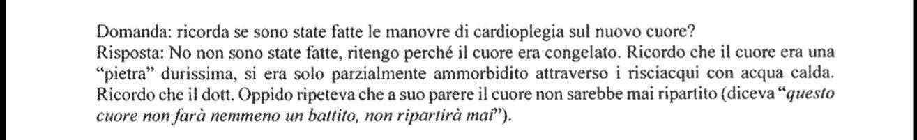 Risposta: No, non sono state fatte, ritengo perché il cuore era congelato. Ricordo che il cuore era una “pietra” durissima, si era solo parzialmente ammorbidito attraverso i risciacqui con acqua calda. Ricordo che il dott. Oppido ripeteva che a suo parere il cuore non sarebbe mai ripartito (diceva “questo cuore non farà nemmeno un battito, non ripartirà mai").