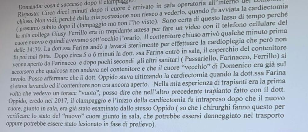Risposta: Circa dieci minuti dopo il cuore è arrivato in sala operatoria all’interno del contenitore chiuso. Non vidi, perché dalla mia postazione non riesco a vederlo, quando fu avviata la cardiectomia (presumo subito dopo il clampaggio ma non l’ho visto). Sono certa di questo lasso di tempo perché mia collega Giusy Ferrillo era in trepidante attesa per fare un video con il telefono cellulare del cuore nuovo e quindi avevamo sott’occhio l’orario. Il contenitore chiuso arrivò qualche minuto prima delle 14:30. La dott.ssa Farina andò a lavarsi sterilmente per effettuare la cardioplegia che però non fu poi mai fatta. Dopo circa 5 o 6 minuti la dott.ssa Farina entrò in sala, il coperchio del contenitore venne aperto da Farinaceo e dopo pochi secondi gli altri sanitari (Passariello, Farinaceo, Ferrillo) si accorsero che qualcosa non andava nel contenitore e che il cuore “vecchio” di Domenico era già sul tavolo. Posso affermare che il dott. Oppido stava ultimando la cardiectomia quando la dott.ssa Farina si stava lavando ed il contenitore non era ancora aperto. Nella mia esperienza di trapianti era la prima volta che vedevo un torace “vuoto”, posso dire che nell’altro precedente trapianto fatto con il dott. Oppido, credo nel 2017, il clampaggio e l’inizio della cardiectomia fu intrapreso dopo che il nuovo cuore, giunto in sala, era già stato esaminato dallo stesso Oppido (so che i chirurghi fanno questo per verificare lo stato del “nuovo” cuore giunto in sala, che potrebbe essersi danneggiato nel trasporto oppure potrebbe essere stato lesionato in fase di prelievo).