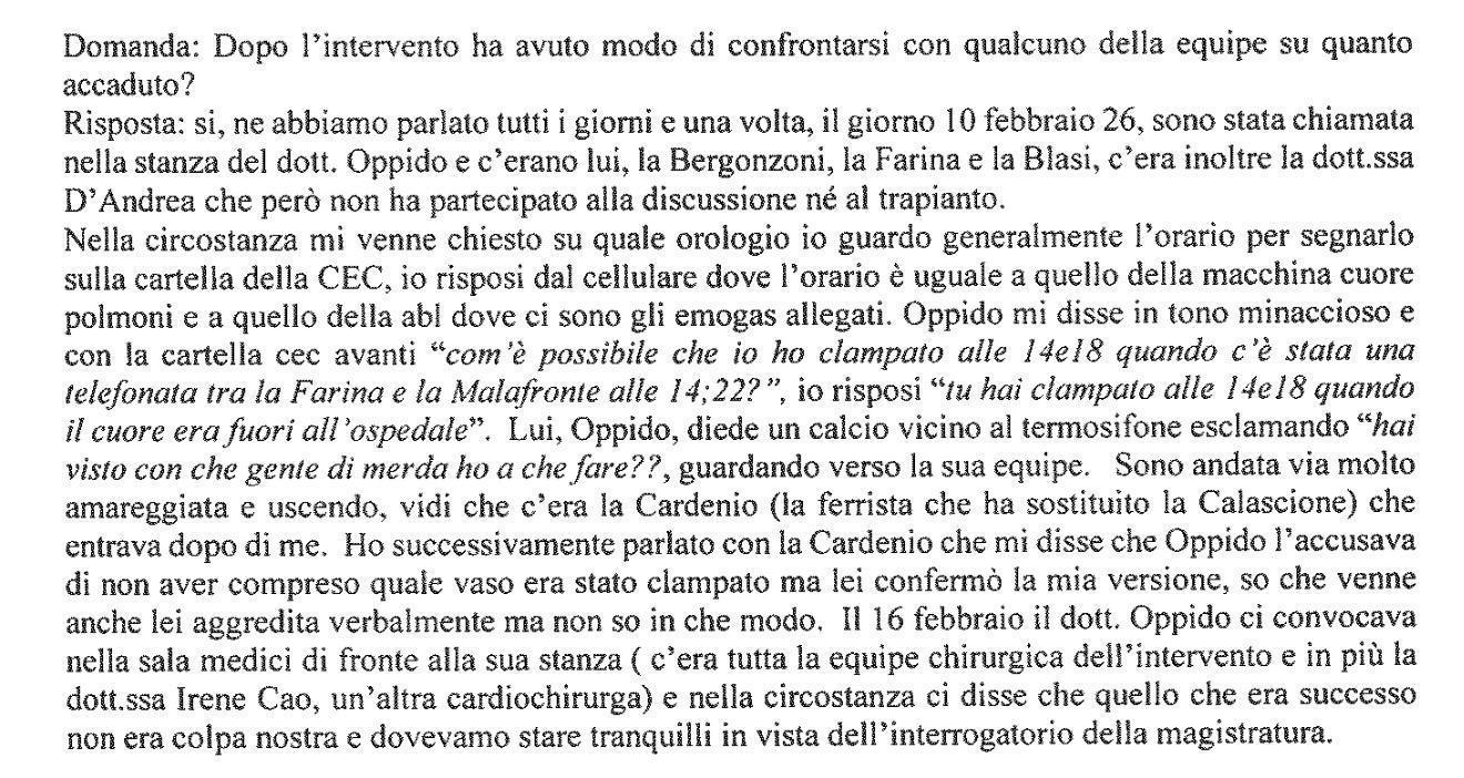 Risposta: sì, ne abbiamo parlato tutti i giorni e una volta, il giorno 10 febbraio 26, sono stata chiamata nella stanza del dott. Oppido e c’erano lui, la Bergonzoni, la Farina e la Blasi, c’era inoltre la dott.ssa D’Andrea che però non ha partecipato alla discussione né al trapianto. Nella circostanza mi venne chiesto su quale orologio io guardo generalmente l’orario per segnarlo sulla cartella della CEC, io risposi dal cellulare dove l’orario è uguale a quello della macchina cuore polmoni e a quello della abl dove ci sono gli emogas allegati. Oppido mi disse in tono minaccioso e con la cartella ceo avanti “com’è possibile che io ho clampato alle 14e18 quando c’è stata una telefonata tra la Farina e la Malafronte alle 14,22?”, io risposi “tu hai clampato alle 14e18 quando il cuore era fuori all’ospedale”. Lui, Oppido, diede un calcio vicino al termosifone esclamando “hai visto con che gente di merda ho a che fare??”, guardando verso la sua equipe. Sono andata via molto amareggiata e uscendo, vidi che c’era la Cardenio (la ferrista che ha sostituito la Calascione) che entrava dopo di me. Ho successivamente parlato con la Cardenio che mi disse che Oppido l’accusava di non aver compreso quale vaso era stato clampato ma lei confermò la mia versione, so che venne anche lei aggredita verbalmente ma non so in che modo. Il 16 febbraio il dott. Oppido ci convocava nella sala medici di fronte alla sua stanza (c’era tutta la equipe chirurgica dell’intervento e in più la dott.ssa Irene Cao, un’altra cardiochirurga) e nella circostanza ci disse che quello che era successo non era colpa nostra e dovevamo stare tranquilli in vista dell’interrogatorio della magistratura.