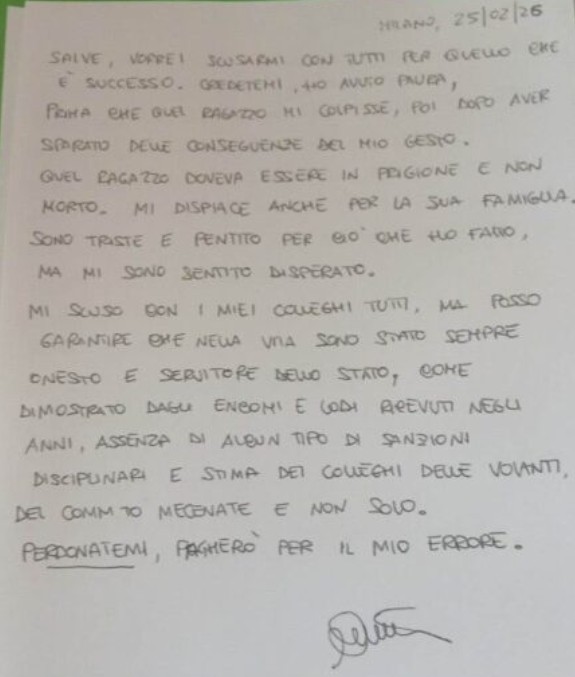 "Salve, vorrei scusarmi con tutti per quello che è successo. Credetemi, ho avuto paura, prima che quel ragazzo mi colpisse, poi - dopo aver sparato - delle conseguenze del mio gesto". Queste le prime quattro righe della lettera di pubbliche scuse scritta in carcere da Carmelo Cinturrino, l'assistente capo di polizia accusato dell'omicidio volontario del pusher Abderrahim Mansouri, ucciso a Rogoredo la sera di lunedì 26 Gennaio.