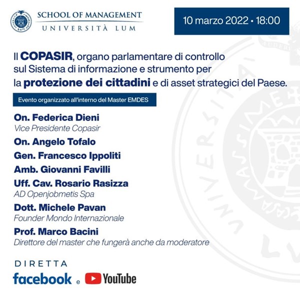 Giovedì 10 marzo alle 18 in occasione degli incontri programmati all'interno del Master EMDES (Diplomatic Economic and Strategic Perspectives in Global Scenarios) della LUM School of Management il prof. Marco Bacini (nella foto), direttore del Master, farà una chiacchierata con l'On. Federica Dieni Vicepresidente del Copasir per spiegare e chiarirne le funzioni.