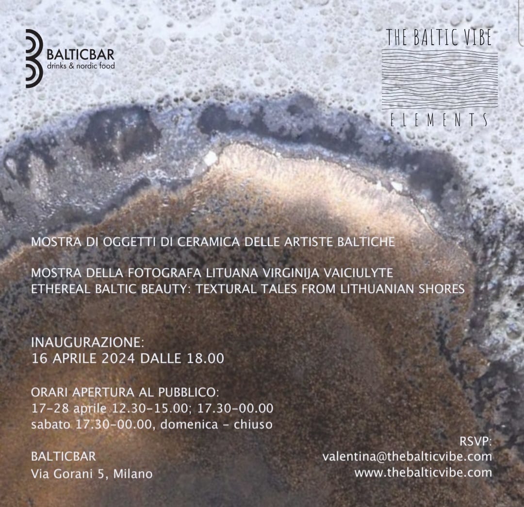 Milano, 15 aprile. Il raffinatissimo bistrot Baltic Bar, punto di ritrovo degli appassionati italiani e stranieri di cibo baltico e di cocktail innovativi, continua ad essere anche location per eventi culturali. Infatti domani sera, martedì 16 aprile alle 18 si inaugureranno nel locale di via Gorani 5, vicino piazza Borromeo, ben due mostre, «The Baltic Vibe. Elements», ceramiche di otto artiste baltiche e «Ethereal Baltic Beauty: Textural Tales from Lithuanian Shores», esposizione della fotografa lituana Virginija Vaiciulyte.
