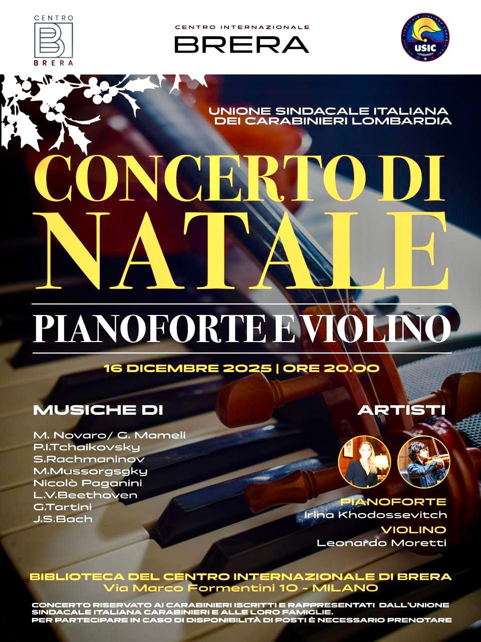 Il Centro Internazionale di Brera ospiterà il 16 dicembre il concerto di Natale in memoria dei carabinieri caduti in battaglia. L'evento, dedicato alle festività natalizie, si terrà alle ore 20:00 presso il Centro Internazionale Brera, in Via Marco Formentini 10.L'evento è co-organizzato dal Centro Internazionale Brera e dall'Unione Sindacale Italiana dei Carabinieri Lombardia, con l'obiettivo di onorare il sacrificio dei militari scomparsi e celebrare lo spirito del Natale.
