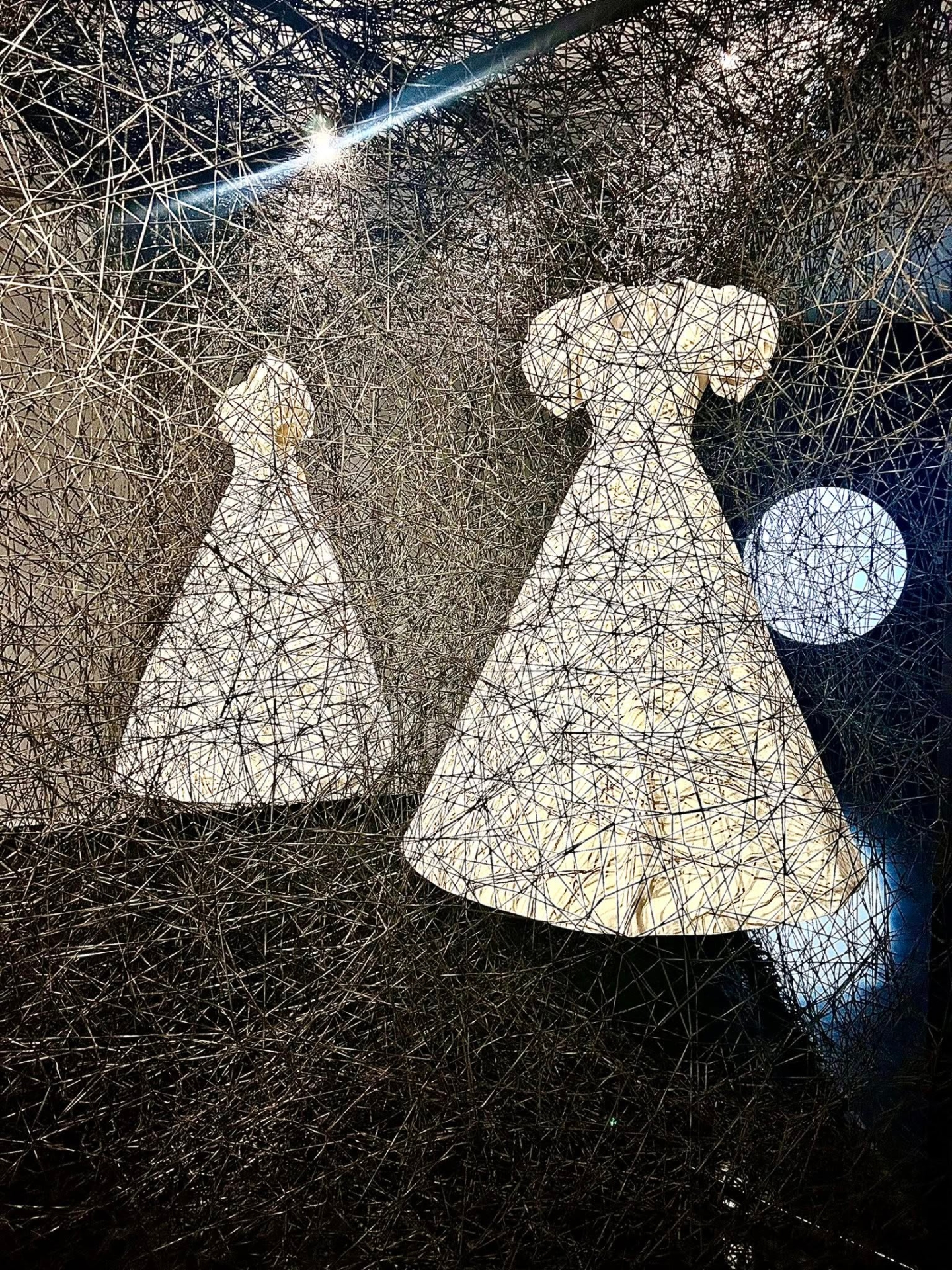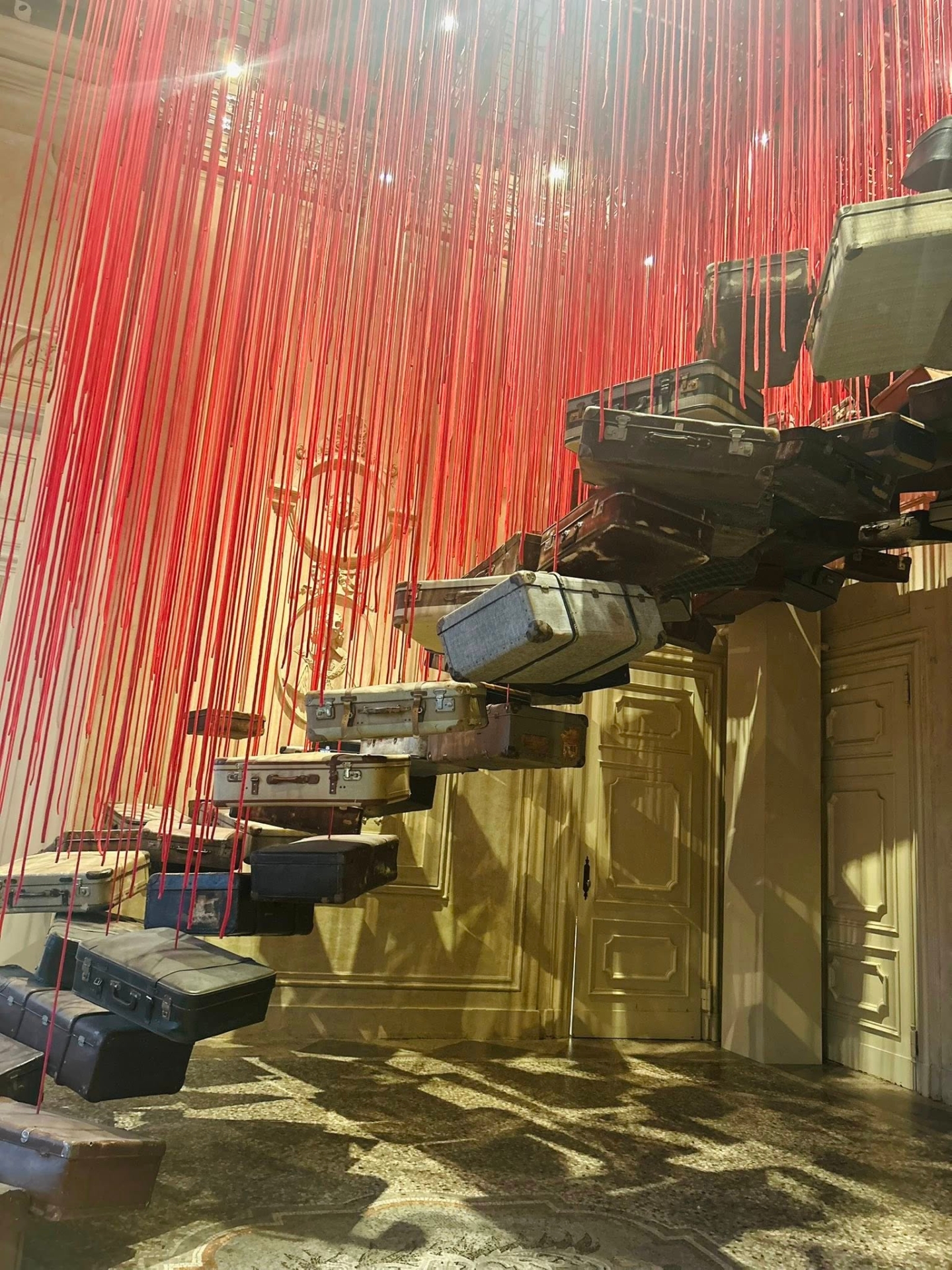 Difficile dimenticare quell’intrico di fili rossi che si dipanava attraverso l’intero padiglione, lasciando indovinare le sagome di due barche di legno che accoglievano, come due mani riunite a formare una coppa, più di 50mila chiavi donate da persone di tutto il mondo. Lo stesso intreccio di fili rossi, o neri, crea oggi al MAO strutture imponenti, che avvolgono e trasformano gli spazi in cui sono collocate, guidando lo spettatore in un’esperienza immersiva in cui la fascinazione si alterna all’inquietudine.