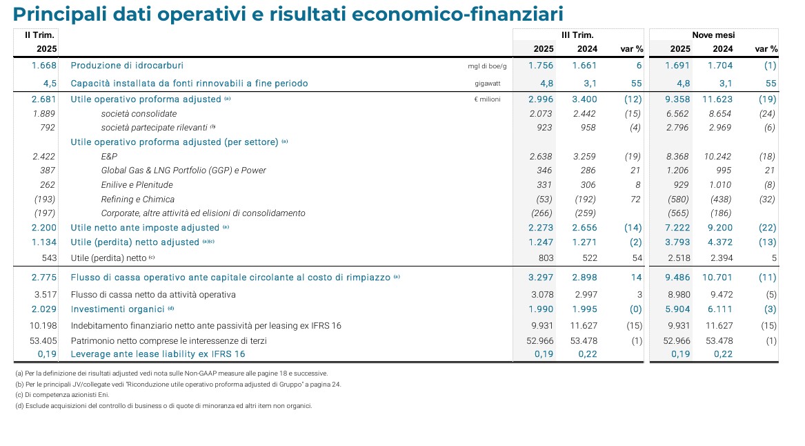 Il Consiglio di Amministrazione di Eni, riunitosi ieri sotto la presidenza di Giuseppe Zafarana, ha approvato i risultati consolidati del terzo trimestre e nove mesi 2025 (non sottoposti a revisione contabile). Claudio Descalzi, AD di Eni, ha commentato: “I risultati del terzo trimestre sono eccellenti e tutte le principali variabili operative, economiche e finanziarie hanno superato le aspettative. La produzione di 1,76 mln barili/giorno è in forte crescita (+6% rispetto allo scorso anno) e ci consente di alzare la guidance annuale sino a 1,72 mln barili/giorno, confermando il trend di accelerazione destinato a proseguire nei prossimi mesi grazie ai nuovi campi in sviluppo in Congo, EAU, Qatar e Libia, e all’avvio della combinazione di business in Indonesia e Malesia che costituirà uno dei principali player sul mercato del GNL nel continente asiatico. La valorizzazione dei nostri business continua con l’incasso dalla cessione del 30% del campo di Baleine in Costa d’Avorio, secondo il consolidato dual exploration model, e con l’avanzamento della cessione del 20% della quota di Plenitude al fondo Ares, per il quale tutte le condizioni sospensive sono state completate. Con questa operazione i due business di Enilive e Plenitude hanno determinato incassi per circa €6,5 mld negli ultimi due anni. Continua anche l’esecuzione della strategia di transizione: il piano di potenziamento dell'hub di Sannazzaro e di conversione di Priolo segnano nuovi progetti di sviluppo della bioraffinazione e contribuiscono al piano di trasformazione del nostro downstream; allo stesso tempo Plenitude ha raggiunto i 4,8 GW di capacità installata di generazione rinnovabile, in linea con l’incremento che traguarda i 5,5 GW entro fine anno. Inoltre, è stata avviata la partnership con GIP destinata a massimizzare il potenziale di crescita delle attività di CCUS del nostro portafoglio. In un contesto di prezzi del greggio deboli e di un euro in rafforzamento, la performance economica finanziaria conferma l’efficacia della nostra strategia e del modello satellitare che consente di assicurare una crescita accelerata e dividendi stabili. L’EBIT proforma è stato solido a €3 mld, così come l’utile netto a €1,2 mld, +20% rispetto alle aspettative. Altrettanto significativa la performance di cassa con un CFFO a €3,3 mld. La leva finanziaria proforma si attesta al 12%, un livello che resta ai minimi storici di Eni, e con una prospettiva a fine anno del 15-18%. In un contesto di prezzi più deboli, grazie all’incremento delle stime di cassa operativa, Eni si distingue nel settore aumentando la distribuzione con un incremento del buyback di €300 mln a €1,8 mld, riducendo al contempo l’indebitamento. In sostanza, il terzo trimestre dimostra come tutti i principali elementi della nostra strategia stiano progredendo con successo in modo contestuale: stiamo crescendo in modo competitivo in tutti i nostri business chiave; nell’upstream stiamo avviando nuovi progetti assicurandoci nel contempo nuove opportunità tramite il nostro know-how esplorativo e tecnologico al top dell’industria; e stiamo aprendoci nuove opportunità nell’ambito della transizione energetica. In parallelo, stiamo creando sempre maggiore valore in termini di gestione rischio/rendimento attraverso il nostro dual exploration model e tramite la strategia satellitare, che ci consentono di ridurre il debito e condividere la creazione del valore con i nostri azionisti.”