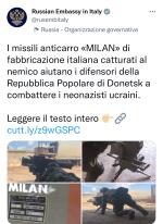 Ieri, giovedì 19 gennaio, sempre su Facebook, l'ambasciata russa aveva pubblicato invece foto dei missili anticarro Milan di fabbricazione italiana “catturati al nemico” e che ora “aiutano i difensori della Repubblica Popolare di Donetsk a combattere i neonazisti ucraini", sottolineando che “almeno quest'arma è in buone mani”. "Nel frattempo, secondo i dati dell'Europol, molte armi della Nato, fornite al regime di Kiev, finiscono sul mercato nero e vengono rivendute alle organizzazioni criminali in Europa e altrove”, evidenziava la rappresentanza diplomatica.