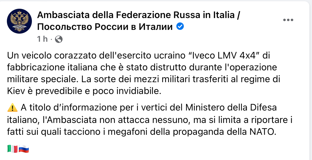 Con un post su Facebook l’ambasciata russa a Roma ha annunciato che “un veicolo corazzato dell'esercito ucraino Iveco LMV 4x4 di fabbricazione italiana è stato distrutto durante l'operazione militare speciale”. L’Iveco LMV 4x4 è il Lince, il mezzo blindato leggero di nuova generazione prodotto da Iveco Defence Vehicles.