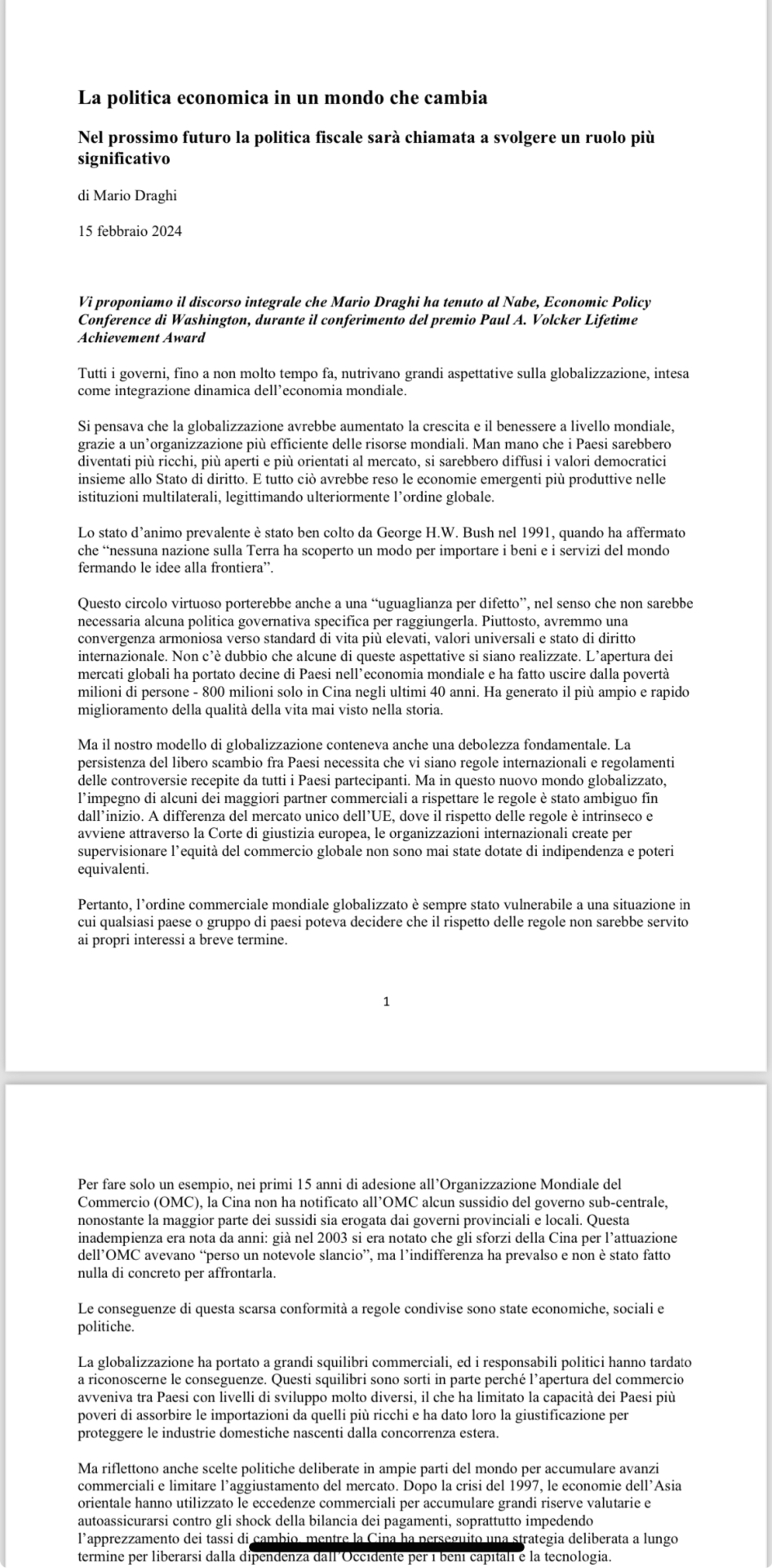 La globalizzazione ha fallito. Lo dice a chiare lettere Draghi, nel suo intervento a Washington. Avvenimenti come la pandemia hanno "messo in evidenza i rischi che derivano da catene di approvvigionamento globali estese per beni essenziali come i medicinali e i semiconduttori".