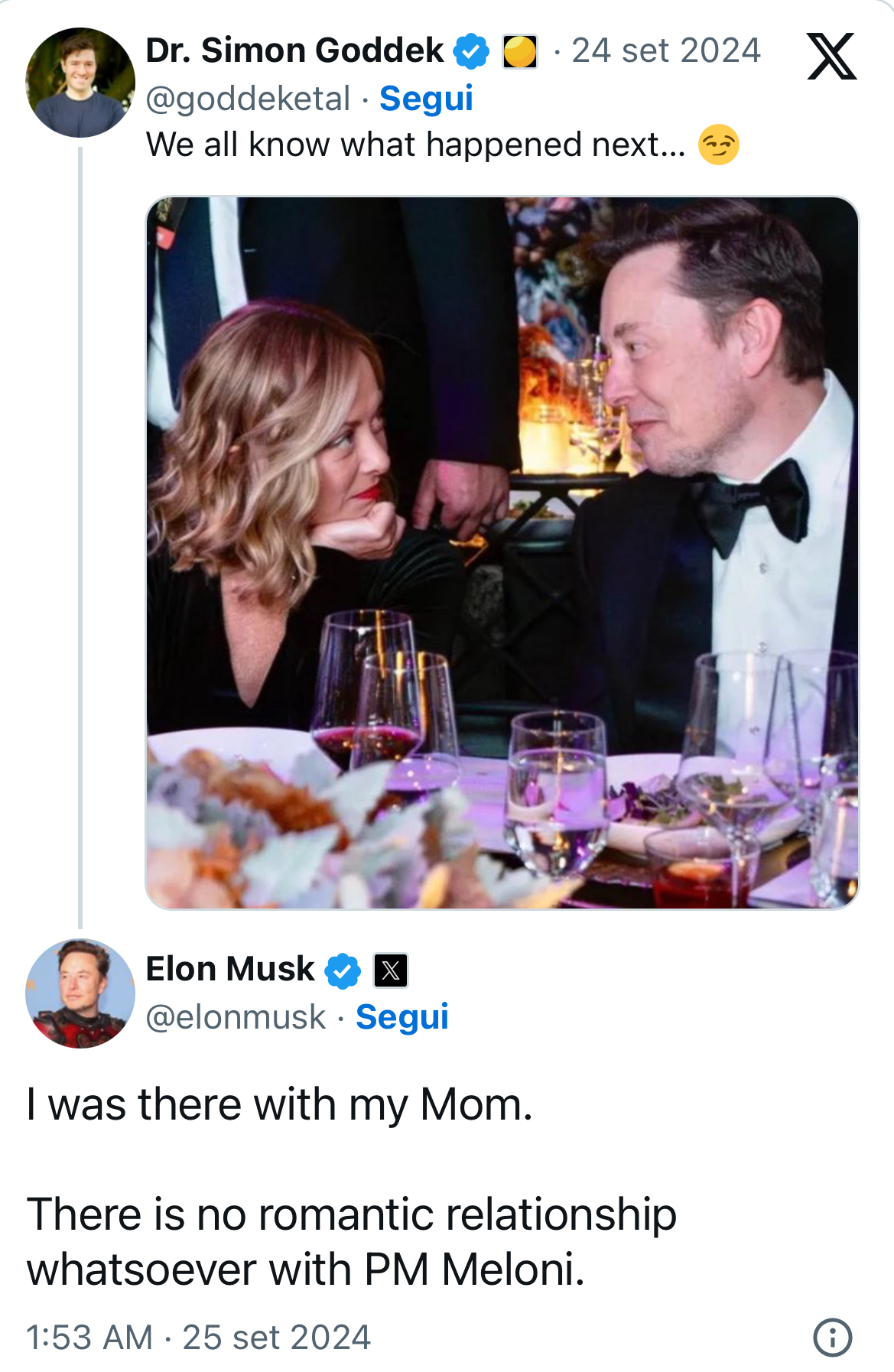 Elon Musk ha risposto alle insinuazioni di Goddeck, sempre con un tweet, smentendo i rumors: “Ero là con la mia mamma. Non c’è assolutamente nessuna relazione romantica con la premier Meloni”. Quindi, tra i due, solo un rapporto di “profonda stima”, come confermato dalle parole di ammirazione scambiate durante la cerimonia di premiazione ai Global Citizen Award.