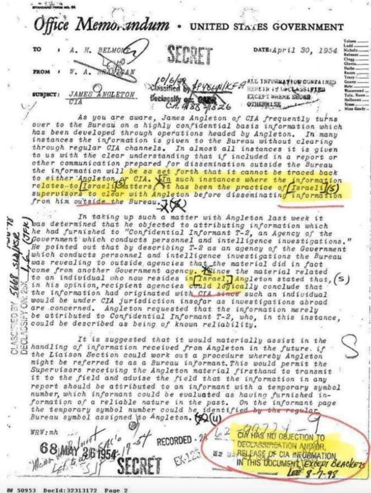 Ancora si è soltanto alle prime scoperte e conferme su quello che si può definire un colpo di Stato in piena regola, e tra tali scoperte e conferme c’è quella che la CIA non voleva rendere pubblico un documento che praticamente confermava come l’intelligence americana fosse eterodiretta da quella israeliana tramite il controllo di uomini più fedeli a Israele che agli Stati Uniti d’America, come l’ex capo del controspionaggio della CIA, James Angleton.