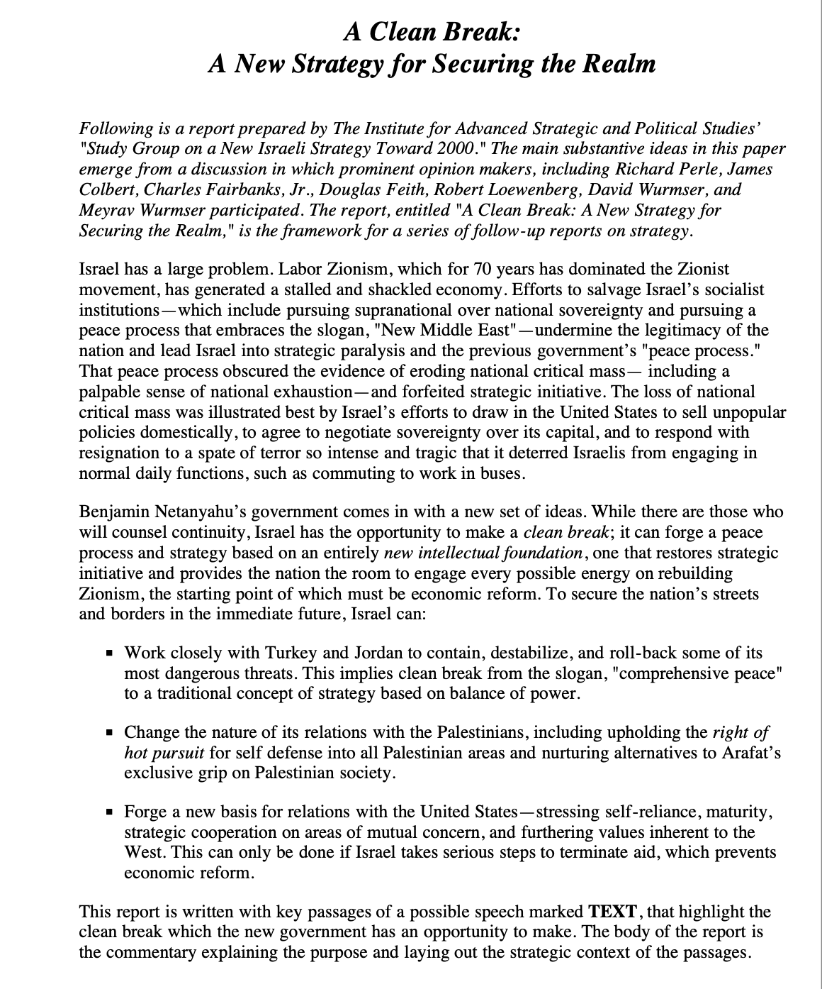 Nel 1996, un gruppo di esperti guidato dall'ex assistente del Segretario alla Difesa degli Stati Uniti, Richard Perle, redasse un documento strategico destinato a Benjamin Netanyahu, Primo Ministro di Israele. Quel rapporto, noto come “A Clean Break: A New Strategy for Securing the Realm”, parla della “creazione di uno stato unico” a favore di Israele “con valori occidentali” e incita lo stato ebraico ad “annientare i suoi nemici”.