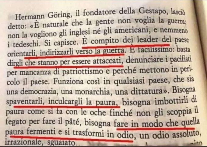 “È compito dei leader del paese orientarli, indirizzarli verso la guerra” – continua Göring – “È facilissimo: basta dirgli che stanno per essere attaccati, denunciare i pacifisti per mancanza di patriottismo e perché mettono in pericolo il paese”. Un meccanismo semplice e spietato, che agisce sul lato più irrazionale dell’essere umano: l’istinto di difesa, la paura dell’invasione, l’odio per il “nemico”.