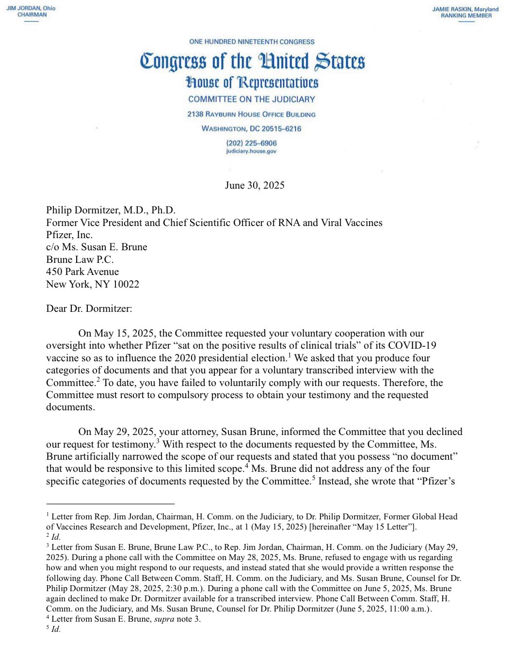 Dormitzer ha pubblicamente negato qualsiasi ritardo nella richiesta di approvazione del vaccino Covid. Il mandato di comparizione richiede sia documenti che una deposizione dall’ex dirigente Pfizer mentre la commissione prosegue la sua indagine.