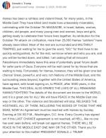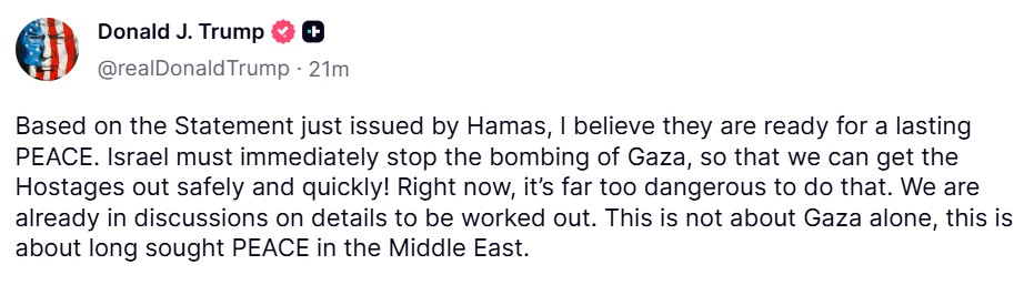 "Sulla base della dichiarazione appena rilasciata da Hamas, credo che siano pronti per una PACE duratura. Israele deve fermare immediatamente i bombardamenti su Gaza, così da poter liberare gli ostaggi in modo sicuro e rapido! In questo momento, è troppo pericoloso farlo. Siamo già in discussione sui dettagli da definire.