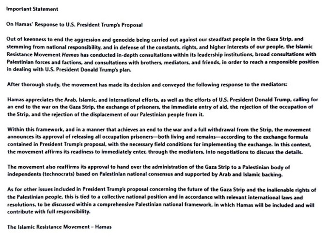 "Per porre fine all’aggressione e al genocidio in corso contro il nostro popolo resistente nella Striscia di Gaza, e partendo da una responsabilità nazionale, nonché in difesa dei principi fondamentali, dei diritti e degli interessi superiori del nostro popolo, il Movimento di Resistenza Islamica Hamas ha condotto approfondite consultazioni con le proprie istituzioni dirigenziali, ampie consultazioni con le forze e le fazioni palestinesi, e colloqui con fratelli, mediatori e amici, al fine di raggiungere una posizione responsabile rispetto al piano del Presidente degli Stati Uniti Donald Trump.