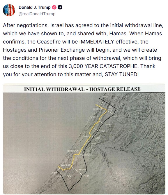 Le trattative diplomatiche per raggiungere un accordo post-bellico che possa soddisfare tutti, sono finalmente in corso. Oggi il tycoon ha comunicato via Truth l'accettazione, da parte dell'Idf, della linea di ritiro, una svolta significativa se si considera che in serata il leader israeliano Netanyahu aveva dettato le sue "linee rosse" insistendo sul fatto che "l'esercito israeliano continuerà a presiedere tutte le aree che controllano la Striscia in profondità". "Hamas - ha poi minacciato Netanyahu - verrà disarmata e la Striscia di Gaza sarà smilitarizzata. Ciò avverrà per via diplomatica, secondo il piano di Trump, o militarmente da parte nostra". "Dopo i negoziati, Israele ha accettato la linea di ritiro iniziale, che abbiamo mostrato e condiviso con Hamas. Quando Hamas confermerà, il cessate il fuoco entrerà IMMEDIATAMENTE in vigore, inizierà lo scambio di ostaggi e prigionieri e creeremo le condizioni per la fase successiva di ritiro, che ci porterà vicini alla fine di questi 3mila ANNI DI CATASTROFE" ha scritto il tycoon aggiungendo sotto un'immagine raffigurante l'"iniziale linea di ritiro" dell'Idf.
