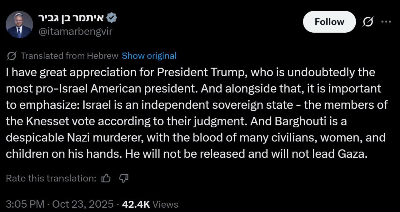 Sulla possibilità di una scarcerazione di Barghouti, sostenitore della soluzione a due Stati, Trump ha dichiarato ieri "Mi è stata posta questa domanda circa 15 minuti prima della sua chiamata. (...) Era la mia domanda. Quindi prenderò una decisione", lasciando così sommariamente intendere di parlare con Israele del rilascio del leader potenzialmente più unificante per Gaza. Ma dai corridoi della politica israeliana Ben-Gvir ha nuovamente cercato di frenare le fantasie di Trump. "Nutro grande stima per il Presidente Trump, senza dubbio il presidente americano più filo-israeliano" attacca Ben-Gvir in un post social. Ma "Barghouti è uno spregevole assassino nazista, con le mani sporche del sangue di molti civili, donne e bambini. Non verrà rilasciato e non guiderà Gaza". Poi il commento sulla decisione della Knesset - bocciata dagli Usa - sulla sovranità di Tel Aviv sul West Bank: "Israele è uno Stato sovrano indipendente: i membri della Knesset votano secondo il loro giudizio". Barghouti, lo ricordiamo, non era tra i prigionieri che Israele ha accettato di rilasciare nell'ambito dell'accordo di cessate il fuoco, nonostante le pressioni dei vertici di Hamas.