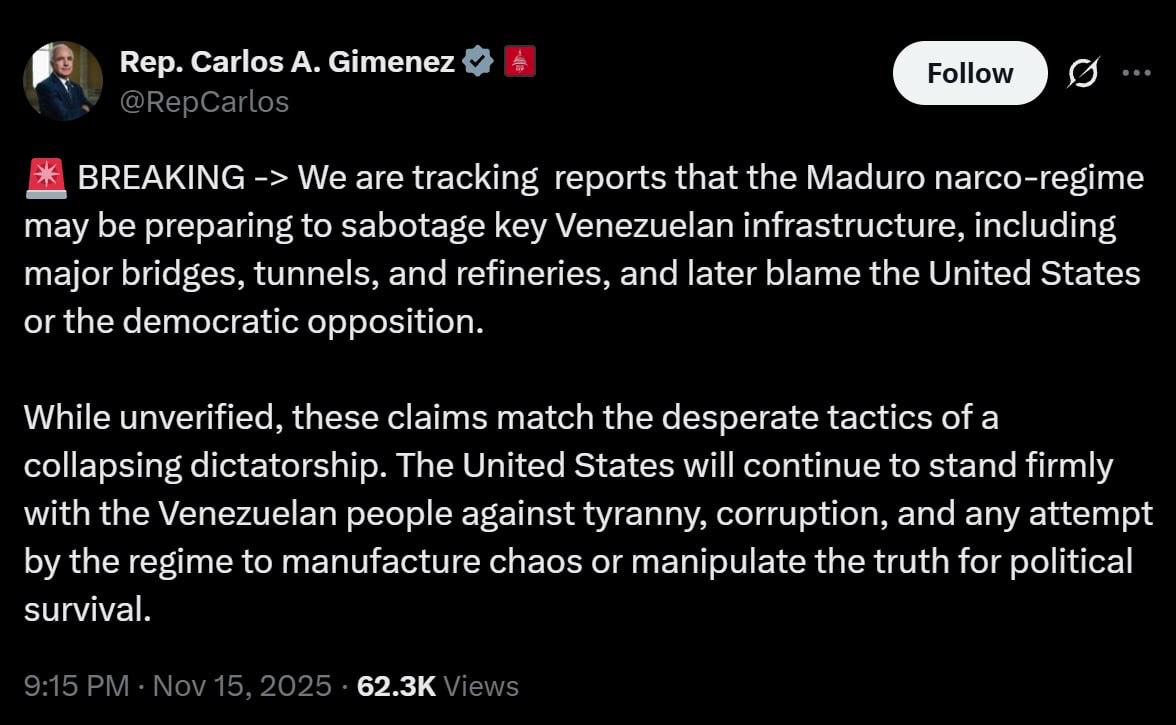 L'alta tensione tra Venezuela e Stati Uniti non si è "esaurita solo" sul versante militare, col dispiegamento americano di imponenti flotte in acque caraibiche e con l'interferenza di agenzie di intelligence per un tentativo di presunta "destituzione" del presidente Maduro. Ora, a quanto riferito direttamente da fonti politiche statunitensi, il Venezuela si starebbe preparando ad incolpare Washington per episodi di attacco mirato ad infrastrutture e punti chiave del servizio pubblico. È questo l'avviso lanciato dal deputato repubblicano di origini cubane Carlos Antonio Giménez in un post social caricato proprio sabato 15 novembre, lo stesso giorno in cui dalla direzione di Corpoelec arrivava una dichiarazione di denuncia di un "sabotaggio criminale" al Sistema Elettrico Nazionale.