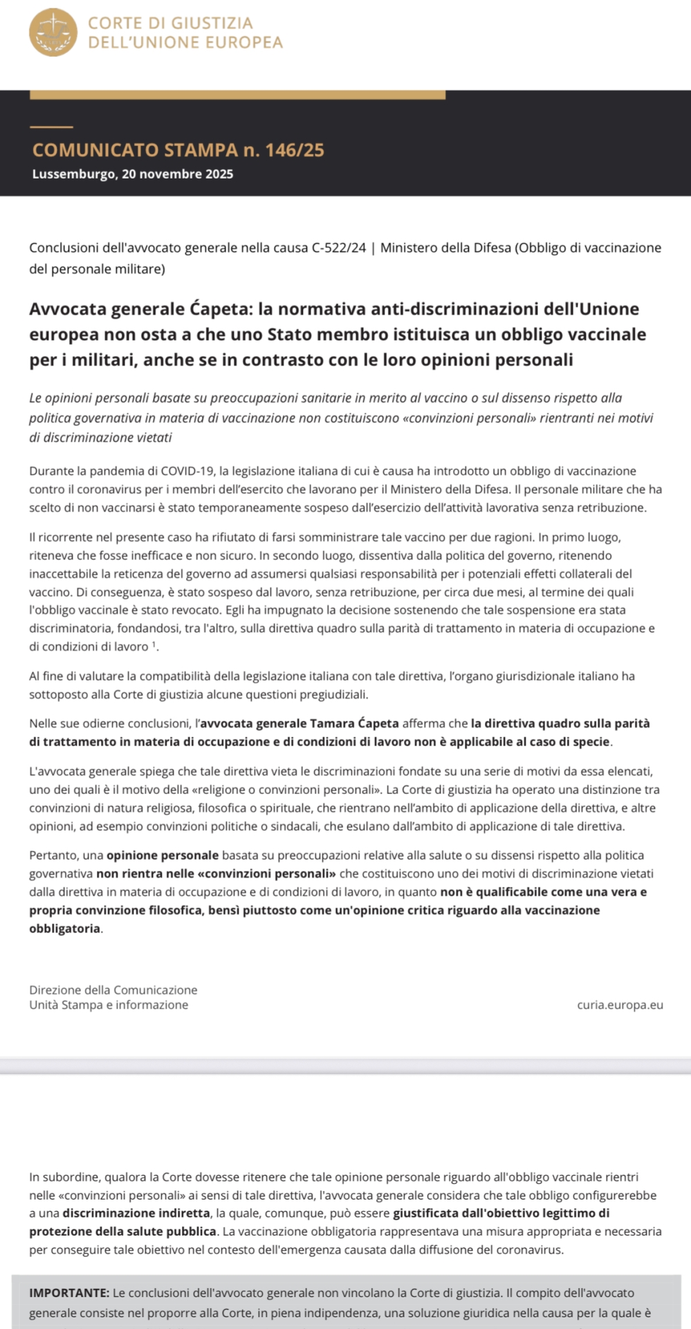 "Le opinioni personali basate su preoccupazioni sanitarie relative agli effetti di un vaccino e il disaccordo con la politica di vaccinazione di un governo non costituiscono una "convinzione" che rientri nei motivi di discriminazione vietati", prosegue l'Avvocato generale Ćapeta, illustrando anch'esso come il siero procurasse reazioni avverse. Sono stati tantissimi nel corso di questi anni i militari e le forze dell'ordine danneggiati dagli effetti avversi del vaccino Covid, documentati da ricostruzioni e dalle denunce che hanno presentato loro stessi.