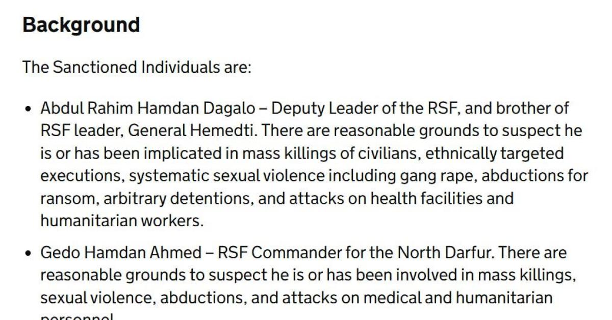 Il Regno Unito ha imposto sanzioni contro quattro comandanti delle RSF (Forze di Supporto Rapido) perché "sospettati" di aver compiuto e preso parte alle atrocità perpetrate contro i civili sudanesi quali "uccisioni di massa, violenze sessuali e attacchi deliberati".