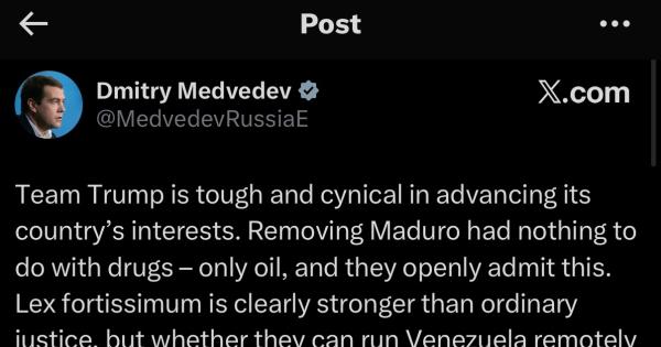 Sul suo account X Medvedev, vicepresidente del Consiglio di Sicurezza russo, accusa gli Stati Uniti: la caduta di Maduro non c’entra con la droga ma con il petrolio. “La legge del più forte batte il diritto”