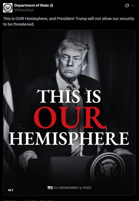 Lo chiamano (gli statunitensi) il "giardino degli Usa". E purtroppo, nella mentalità bellicista statunitense, continua ad esserlo. Il riferimento è a tutti gli Stati dell'America centrale e meridionale su cui la Casa Bianca ha sempre, storicamente, rivendicato una presunta sovranità in nome della retorica "sulla sicurezza" da sempre venduta a buon mercato all'opinione pubblica. Almeno due secoli di ingerenza politica esercitata da Washington sui governi dell'America Latina, stavolta apertamente rivendicata da Trump in due modi. a) direttamente, come rivela un recente post pubblicato dal Dipartimento di Stato su X e recante la scritta "This is OUR Hemisphere, and President Trump will not allow our security to be threatened" ("Questo è il NOSTRO Emisfero, e il Presidente Trump non permetterà che la nostra sicurezza venga minacciata"). E b) indirettamente, appellandosi cioè alla retorica storica della cosiddetta dottrina Monroe.