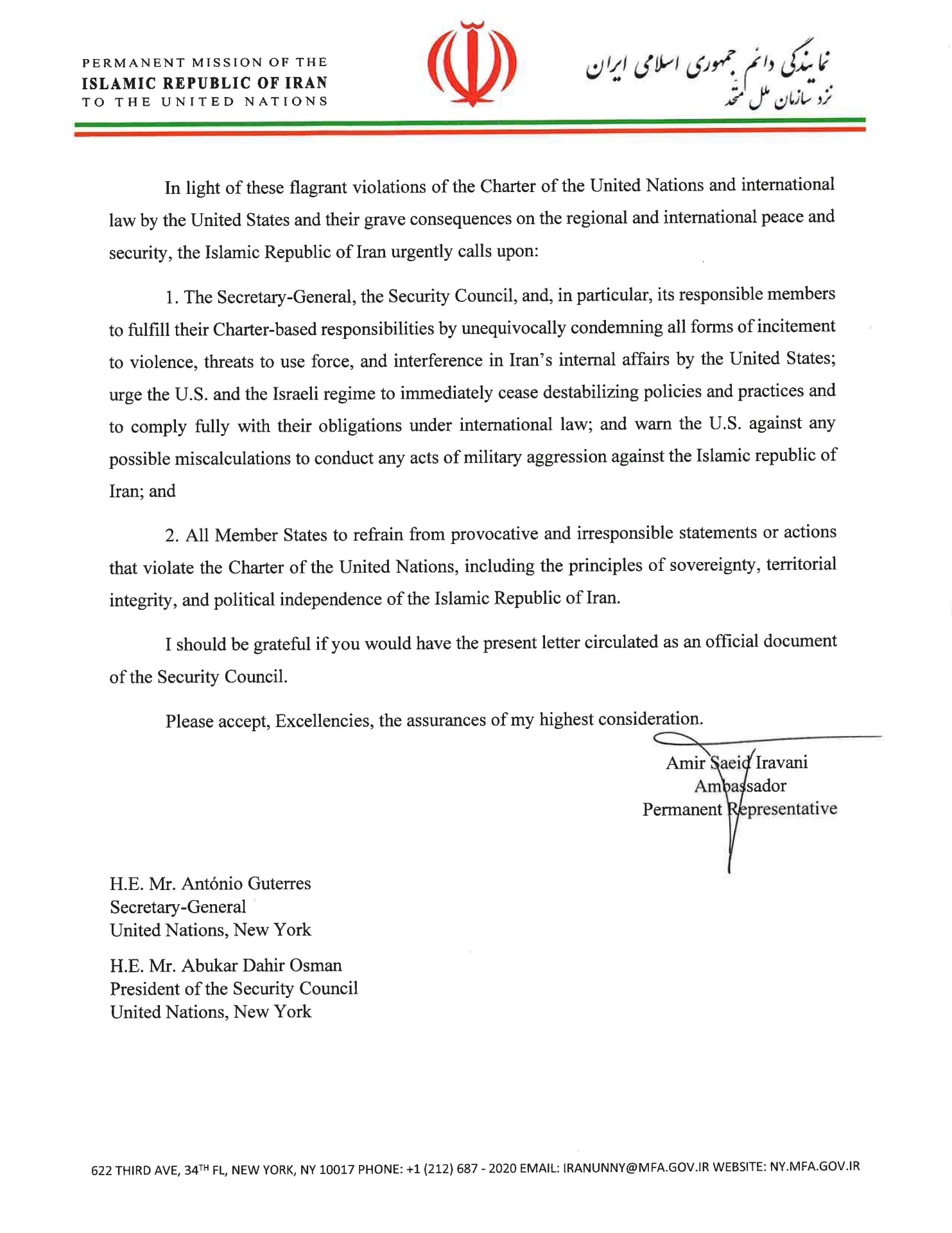 Nel testo, l’ambasciatore iraniano scrive: "La Repubblica islamica dell'Iran invita urgentemente il segretario generale, il Consiglio di sicurezza e, in particolare, i suoi membri responsabili ad adempiere alle proprie responsabilità sancite dalla Carta, condannando inequivocabilmente tutte le forme di incitamento alla violenza, minacce di ricorso alla forza e ingerenza negli affari interni dell'Iran da parte degli Stati Uniti; esorta gli Stati Uniti e il regime israeliano a cessare immediatamente le politiche e le pratiche destabilizzanti e a rispettare pienamente i propri obblighi ai sensi del diritto internazionale; e mette in guardia gli Stati Uniti da eventuali errori di calcolo nel condurre atti di aggressione militare contro la Repubblica islamica dell'Iran".