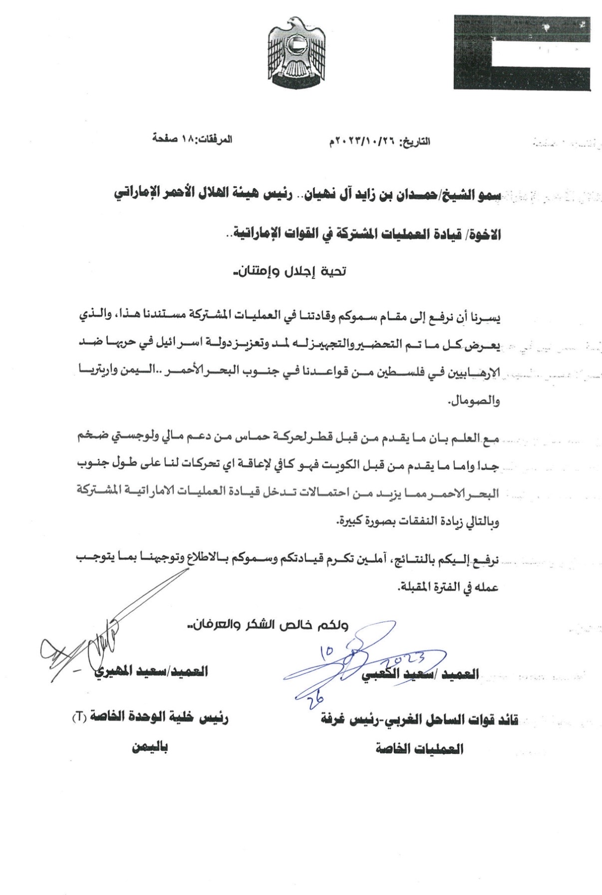 Il documento è indirizzato al Comando delle Operazioni Congiunte delle Forze Armate degli Emirati ed è firmato da Hamdan bin Zayed Al-Nahyan, rappresentante della regione di Al-Dhafra e presidente della Mezzaluna Rossa emiratina. Fin dalle prime righe, il testo fa riferimento agli attacchi del 7 ottobre 2023 e richiama gli accordi di cooperazione bilaterale, giustificando l’attivazione delle basi emiratine situate nel sud del Mar Rosso, tra cui Al-Mokha nello Yemen occidentale e strutture militari in Eritrea e Somalia.