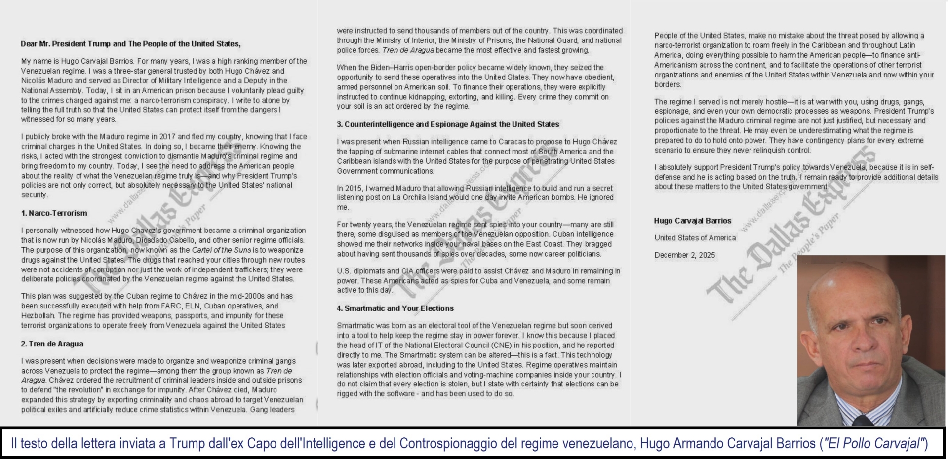 Gli esperti giornalisti Latino-americani, in testa quelli della nota televisione “Univision”, come anche “NTN24”, canale internazionale che trasmettono in tutto il continente americano le ultime notizie dal Venezuela, dalla Colombia e compresi Messico e Stati Uniti, ma pure la venezuelana Sebastiana Barráez (giornalista investigativa militare e di frontiera) spiegano che anche se questo tentativo del Generale possa nascondere l’ultimo sforzo di mediare la sua imminente condanna, nulla potrà distorcere il quadro che loro stessi hanno denunciato per decenni. Ne sono stati testimoni e attori diretti. Hanno visto ll'emergere di megabande, come il “Tren de Aragua” e la tolleranza, per non parlare della protezione, che gli alti funzionari del regime di Maduro hanno garantito a questa organizzazione.. fino all’ultimo incredibile supporto che hanno dato al leader di questa organizzazione, Niño Guerrero, permettendogli di fuggire dalla prigione di Tocorón, con tutti i suoi uomini, poche ore prima del raid della Delta Force americana. Non avrebbe potuto farlo senza la chiara complicità e la partecipazione di alti funzionari militari delle Forze Armate venezuelane.