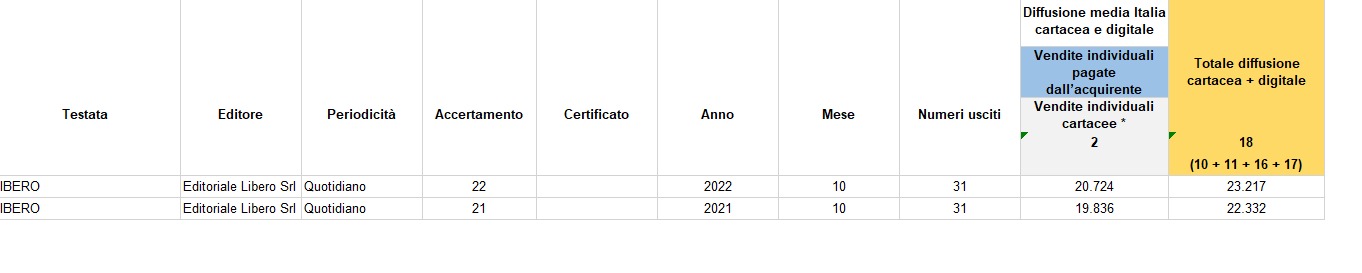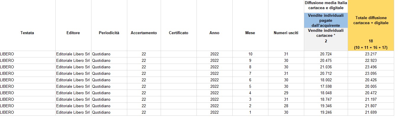 Libero registra invece un leggero aumento delle vendite cartacee: se confrontiamo il mese di ottobre del 2022 con quello dello scorso anno notiamo infatti un aumento del 4,28% ( 20.724 vs 19.836).