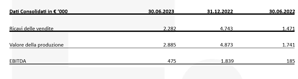 Il valore della produzione è pari a Euro 2.884.524, con un incremento del 65,7% rispetto a Euro 1.741.279 al primo semestre 2022. Dopo aver spesato costi della produzione per Euro 2.409.481 l’EBITDA è pari a Euro 475.043, registrando un incremento del 156,3% rispetto a Euro 185.368 del primo semestre 2022.