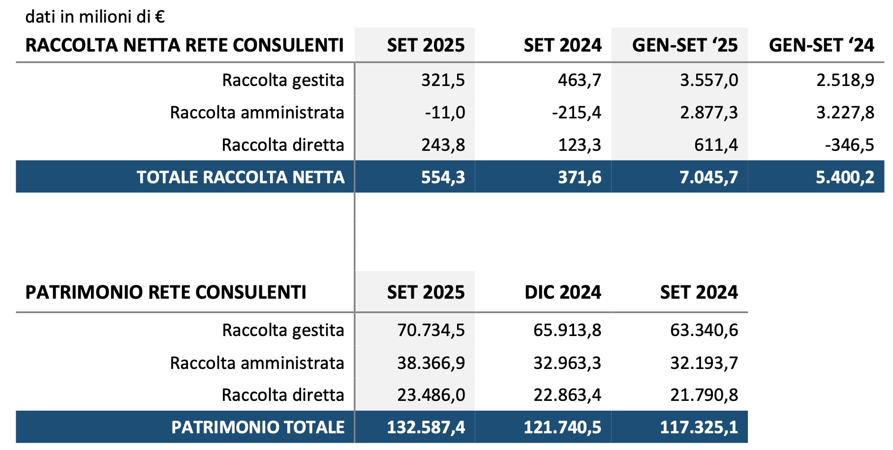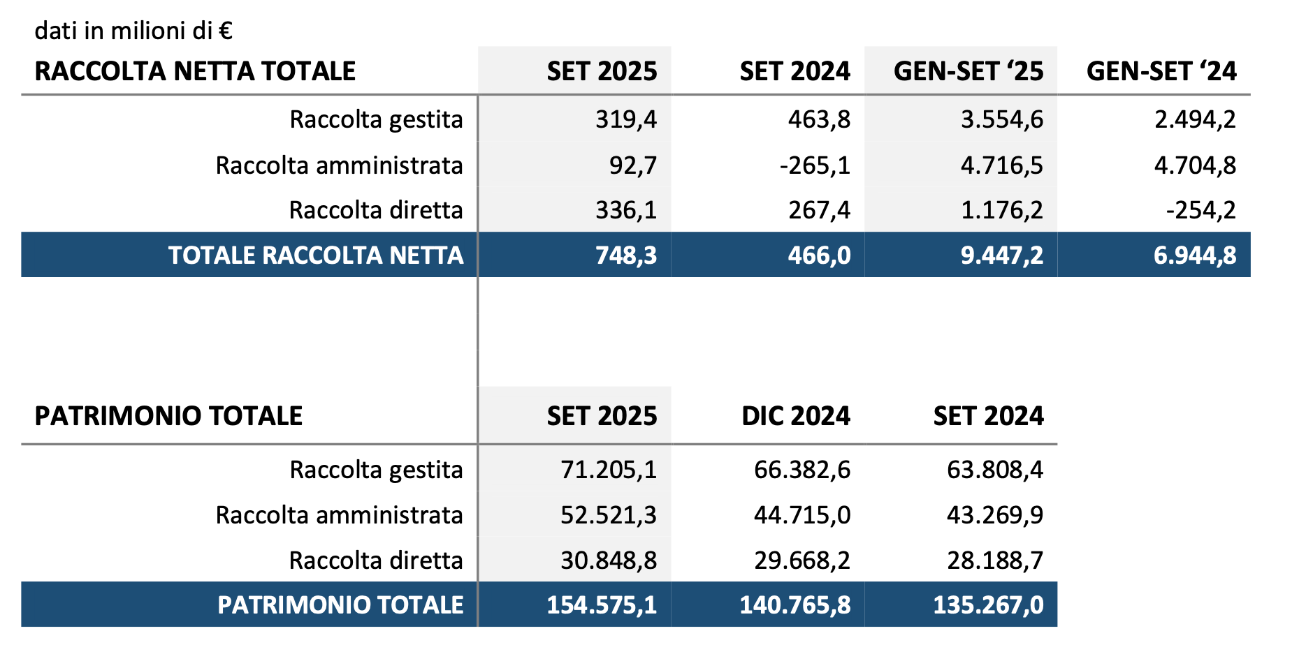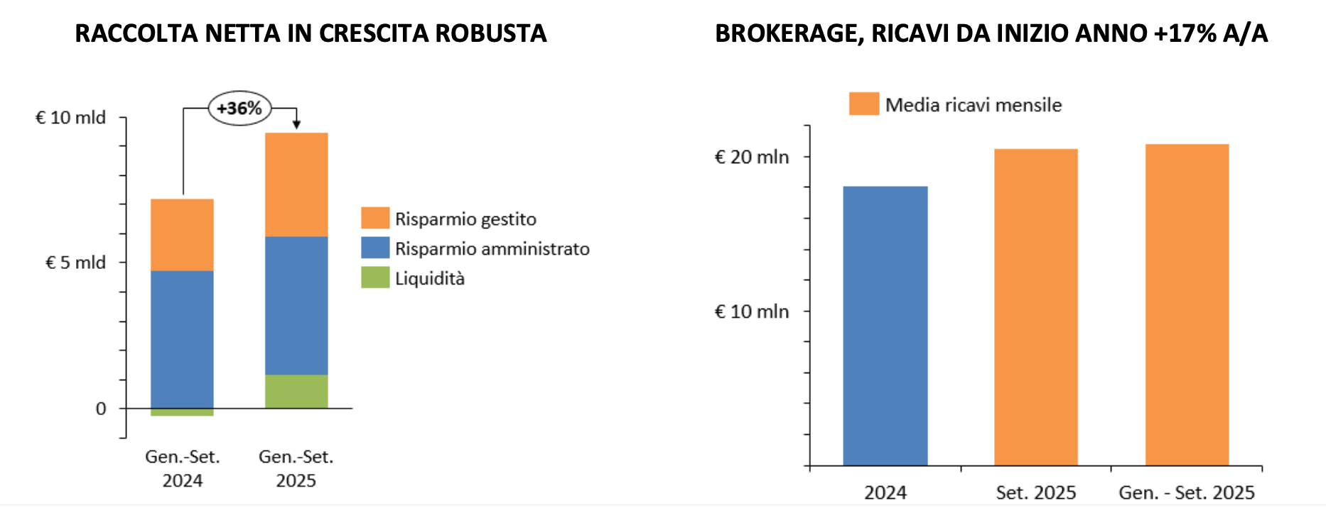 Il Patrimonio totale è pari a € 154,6 miliardi, rispetto a € 135,3 miliardi di settembre 2024 (+14%). In particolare, le masse del Private Banking si attestano a € 77,6 miliardi da € 64,8 miliardi di un anno fa (+20%).