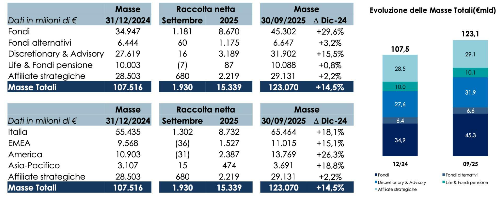 Alessandro Zambotti, CEO e CFO del Gruppo, commenta: “Il forte slancio delle nostre attività di raccolta è proseguito anche nel mese di settembre con una raccolta netta pari a € 1,9 miliardi, superando ancora una volta il livello raggiunto dai nostri concorrenti italiani. Questo risultato sottolinea l'efficacia della nostra piattaforma di distribuzione globale e la solidità delle relazioni con i clienti nei canali retail, wealth management, imprese e istituzionali. La domanda per le nostre soluzioni di fondi comuni, trainata dal nostro business italiano e dalle partnership, è rimasta particolarmente elevata. Inoltre, la nostra affiliata strategica statunitense ha registrato una significativa crescita organica grazie all'espansione della propria rete di società partner. Sostenuta da questo modello di business diversificato e resiliente, Azimut ha raccolto oltre € 15 miliardi in nove mesi, portando le masse totali a € 123,1 miliardi alla fine di settembre, con un aumento del 14,5% da inizio anno.”