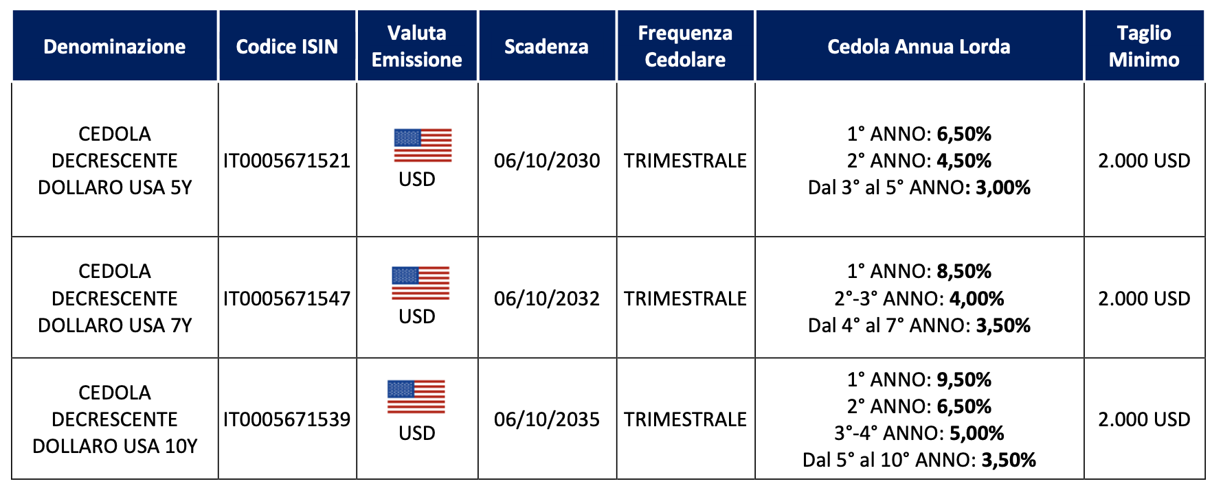 In particolare, il Cedola Decrescente Dollaro USA con scadenza 5 anni (IT0005671521) offre cedole trimestrali calcolate ad un tasso annuo che parte il primo anno dal 6,50% lordo, il Cedola Decrescente Dollaro USA con scadenza 7 anni (IT0005671547) offre all’investitore cedole trimestrali calcolate ad un tasso di interesse annuo lordo che parte il primo anno dall’8,50%, infine il Cedola Decrescente Dollaro USA con scadenza 10 anni (IT0005671539) offre cedole trimestrali calcolate ad un tasso annuo che parte il primo anno dal 9,50% lordo.