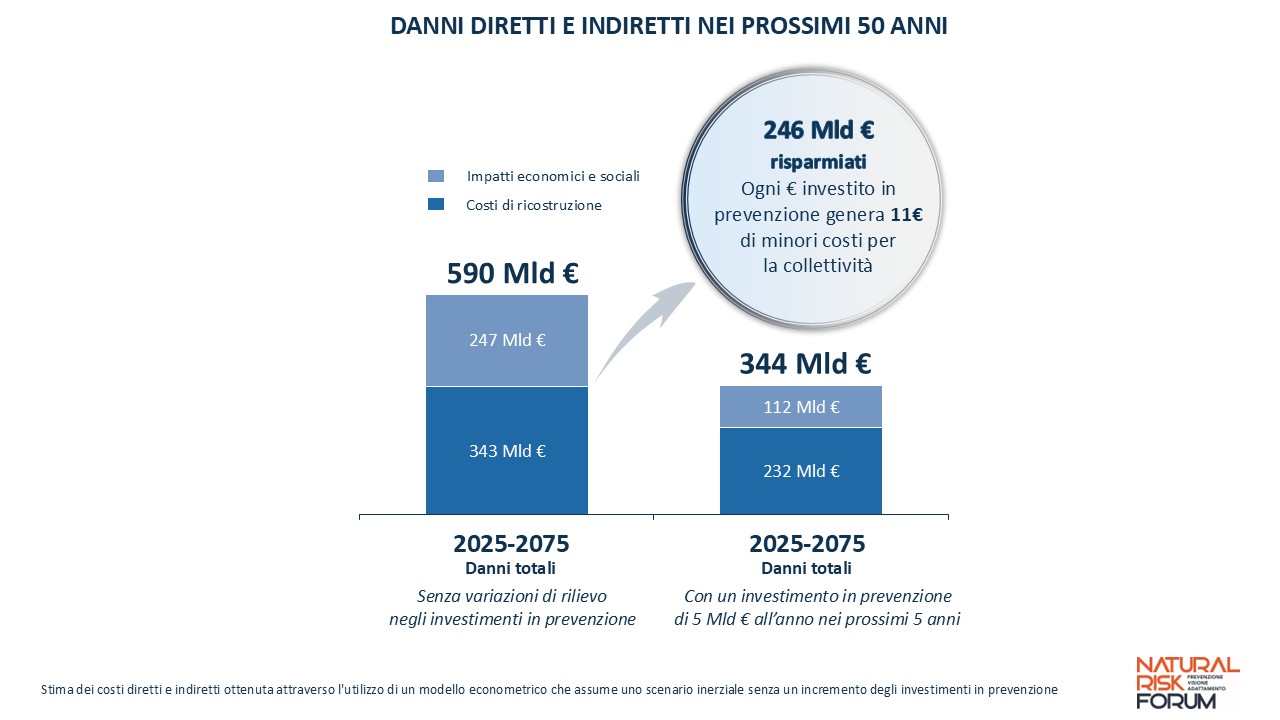 Lo studio ha quindi sviluppato una proiezione sui prossimi cinquant’anni, stimando – in uno scenario inerziale, privo di interventi aggiuntivi in prevenzione – danni diretti per circa 343 miliardi di euro e danni indiretti per ulteriori 247 miliardi. Il danno totale attualizzato risulta pari a 590 miliardi di euro.