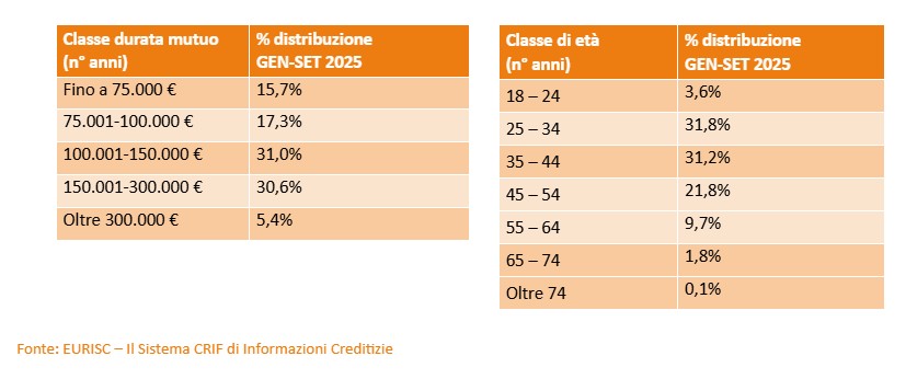 Per quanto riguarda la distribuzione per fascia di importo, nei primi nove mesi del 2025 le richieste di mutuo per importi compresi tra 100.000 e 150.000 euro restano ancora la soluzione preferita dalle famiglie italiane (31,0% del totale) seguita da quella successiva 150.001-300.000 (30,6%). Se analizziamo la fascia di età, invece, emerge che i richiedenti tra i 25 e i 44 anni sono il 63% del totale, mentre il 31,5% è composto dai 45-64 anni.